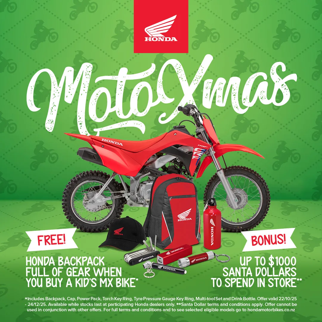 Score up to $1000 Honda Dollars to spend instore and a kids backpack full of goodies this Christmas when you purchase a new kids bike from your Honda motorbike dealer.