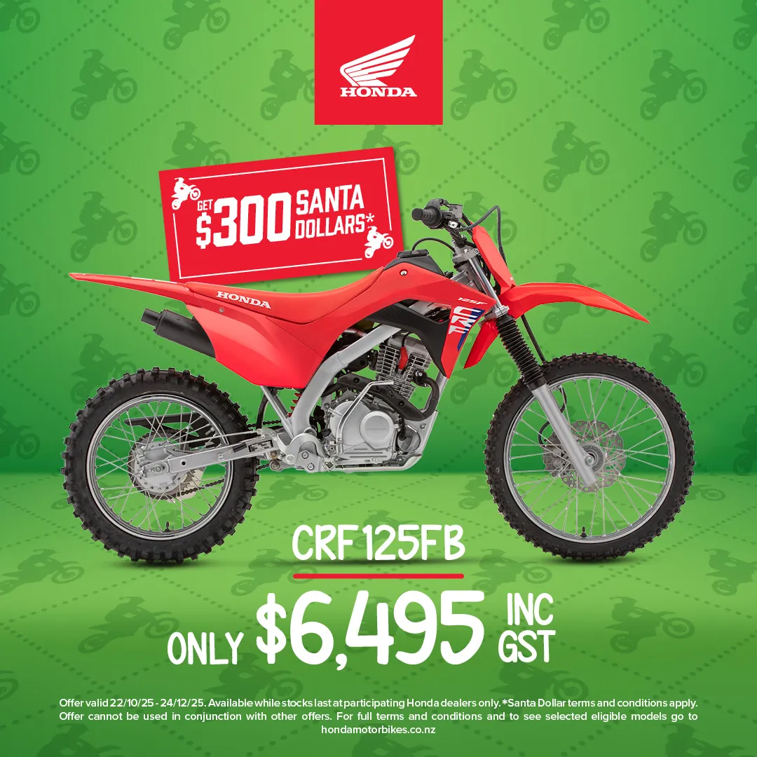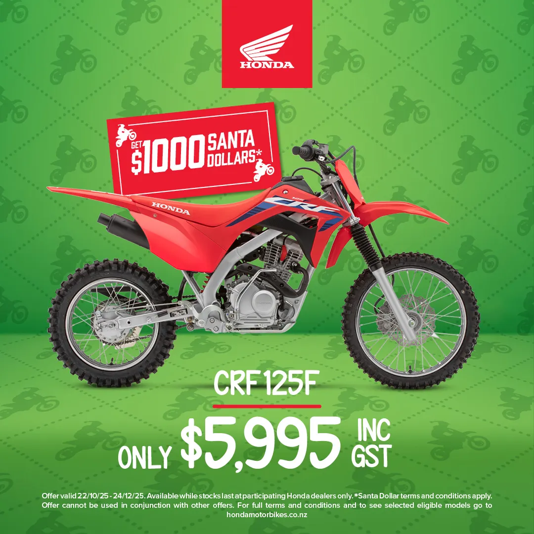 *Back pack full of gear includes Backpack, Cap, Power Pack, Torch Key Ring, Tyre Pressure Gauge Key Ring, Multi-tool Set and Drink Bottle. Offer valid 22/10/25 - 24/12/25. Available while stocks last at participating Honda dealers only. CRF50F (2025 Red & 2024 White/Pink) - Get $150 Honda Dollars + Backpack full of gear, CRF110F (2025 Red & 2023 White/Teal) - Get $200 Honda Dollars + Backpack full of gear, CRF125F (2023) - Get $1000 Honda Dollars + Backpack full of gear, CRF125FB Big Wheel (2025/2026) - Get $300 Honda Dollars + Backpack full of gear. **Honda Dollars must be spent instore at your local Honda motorbike dealer. Honda Dollars are valid till 31st March 2026 and cannot be exchanged for cash or any other equivalent. Offer cannot be used in conjunction with other offers.